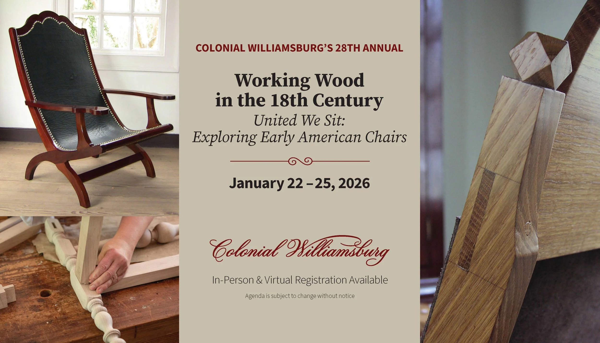 The Colonial Williamsburg Foundation is pleased to offer a limited number of scholarships for students to attend the 28th Annual Working Wood in the 18th Century Conference. This year's program, "United We Sit: Exploring Early American Chairs" will be held in person & virtually January 22-25, 2026.