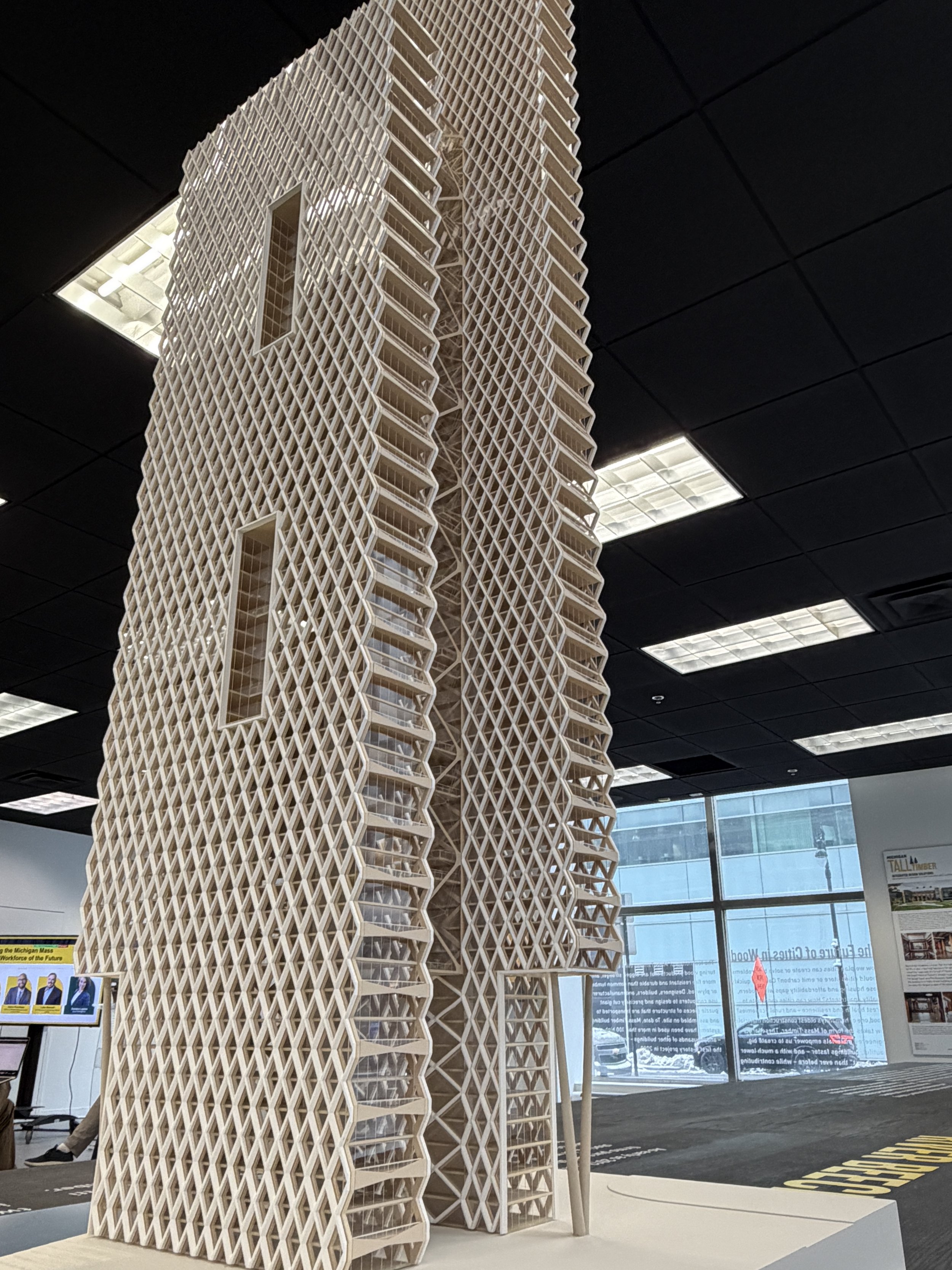 A scale model of mass timber construction at the “Tall Timber: Cities in Wood” Exhibition.